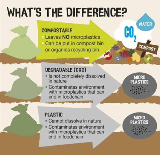 Degradable bags are made from plastic with other chemicals added (including heavy metals) that cause the plastic to break down and disintegrate over time when exposed to sunlight and heat. Like degradable bags, biodegradable are often still plastic bags that have microorganisms added to break down the plastic.